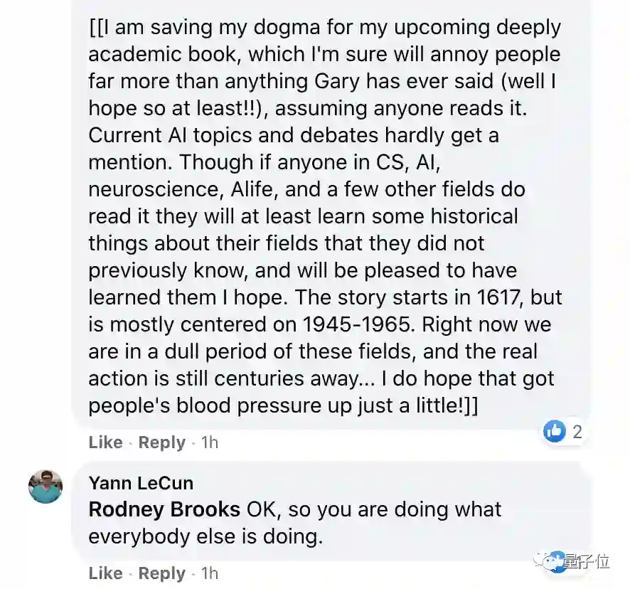 在Facebook对话下回复LeCun的,是Robust.AI的CTO,MIT松下机器人研究院的教授Rodney Brooks。