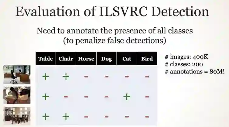 ILSVRC 检测的评估需要注解所有出现的类别,从而对虚假检测做出惩罚。ILSVRC 图像达 40 万张,类别数量为 200,注解有 8000 万个。