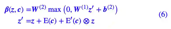 简单来说,它就是把条件 c 作为 β,γ 的条件,然后构成条件 BN,替换掉生成器的无条件 BN。也就是说,生成器的主要输入还是随机噪声 z,然后条件 c 则传入到生成器的每一个 BN 中。