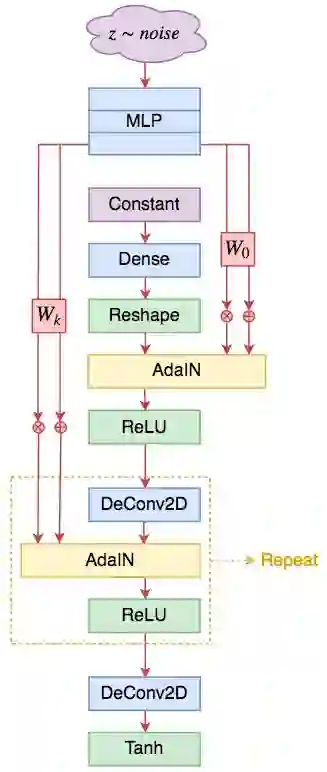 3. AdaIN 的输入条件是将噪声用多层 MLP 变换后,再用不同的变换矩阵投影为不同 AdaIN 的 β 和 γ。