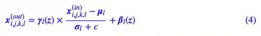 StyleGAN 的核心,是一个叫做AdaIN(Adaptive Instance Normalization)的玩意,来源于风格迁移的文章 Arbitrary Style Transfer in Real-time with Adaptive Instance Normalization [7]。它其实跟条件 BN 差不多,甚至比条件 BN 还简单: