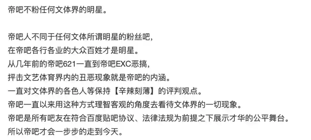 在一则置顶的介绍帖中,有吧友这样写道:“抨击文艺体育界内的丑恶现象,就是帝吧的内涵。”