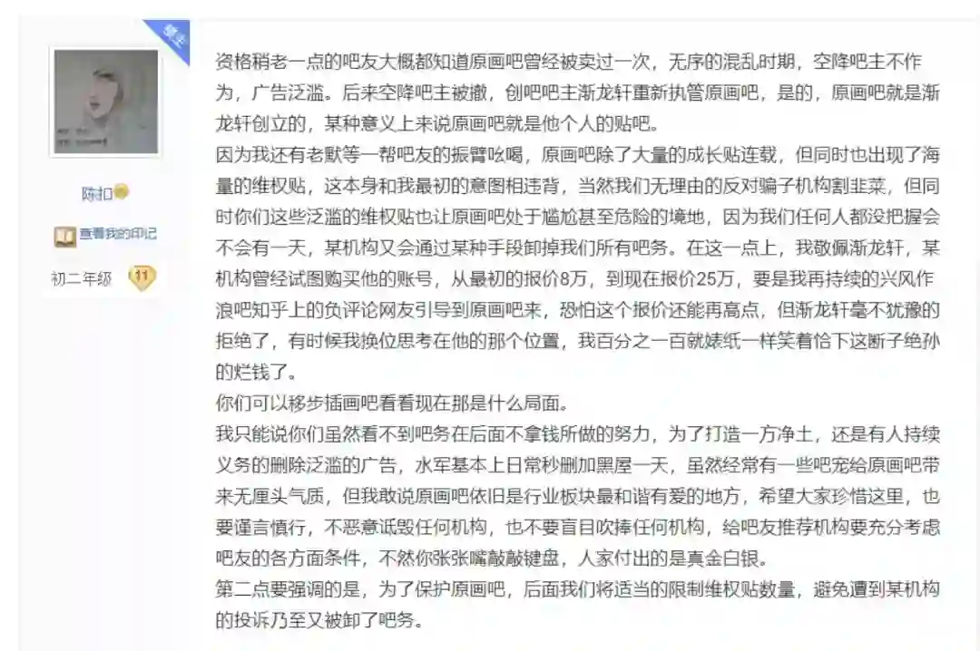 用户@画画的花噎菜曾在知乎表示,2014年时她曾经是原画吧大吧主,后来亲眼看着原画吧被美术培训机构火星时代买走,贴吧一夜之间就从培训爆料平台,变成了培训机构的避风港。“就算后来原画吧被其他老吧主拿了回来,也不在上面花费一丝心血了我觉得。”