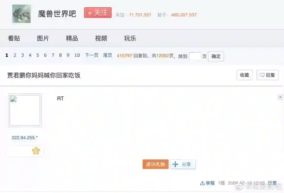 2009年,《魔兽世界》的火爆,让WOW吧逐渐成为百度第一大贴吧。同年7月,网友在魔兽世界吧发布了标题为《贾君鹏你妈妈喊你回家吃饭》的帖子,三分钟后,“贾君鹏”在6楼出现,回复“不回去吃饭”。该帖在6个小时内获得了39万的点击量,有超过1.7万网友参与回贴,被称为“中文网络的奇迹”,这句话也因此成为年度流行语。