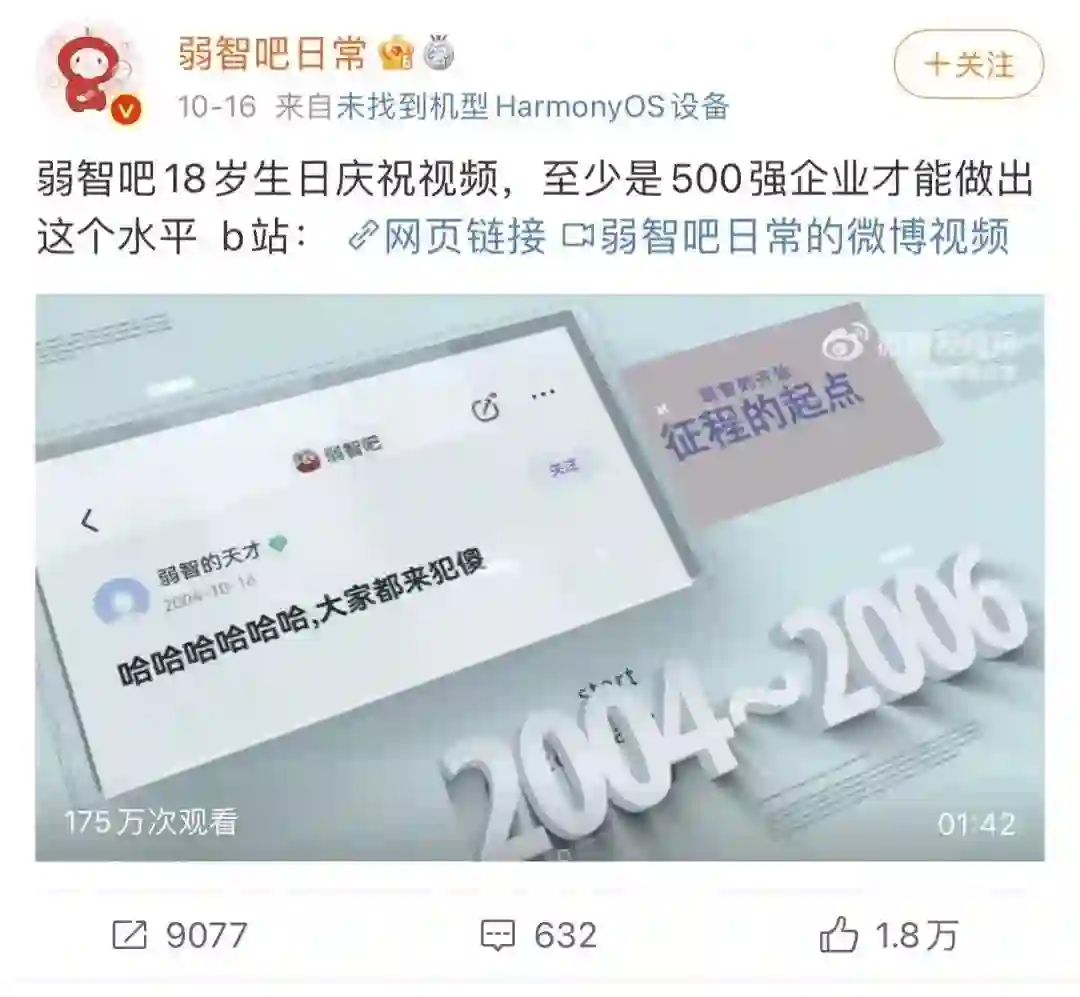 “至少是500强企业才能做出这个水平。”粉丝数超60万的官博“弱智吧日常”发布了一支庆生视频并附文道。这支视频,囊括了18年弱智吧年度金句,如“每次在大街上洗澡,总觉得有人在偷窥我”“为防止作弊,所有考生一律不得进入考场”。