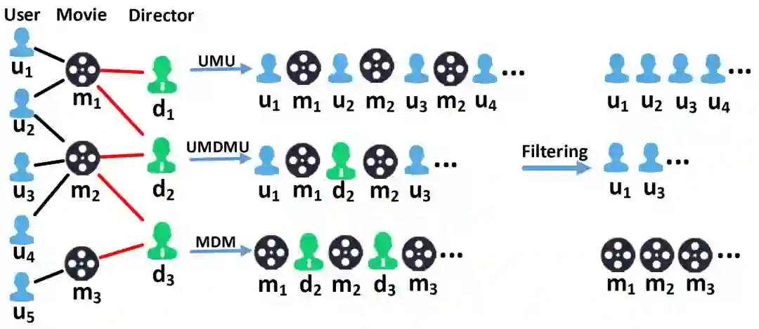 图的左侧是一个异构网络,包含三种节点:User、Movie和Director。在图中,User对应user,Movie对应item,在特征提取流程中,我们希望为每个user(User)和item(Movie)学习多个特征向量表示。Director在这里被认为是Movie的attribute,RandomWalk可以借助attribute节点为user或item建立关系。