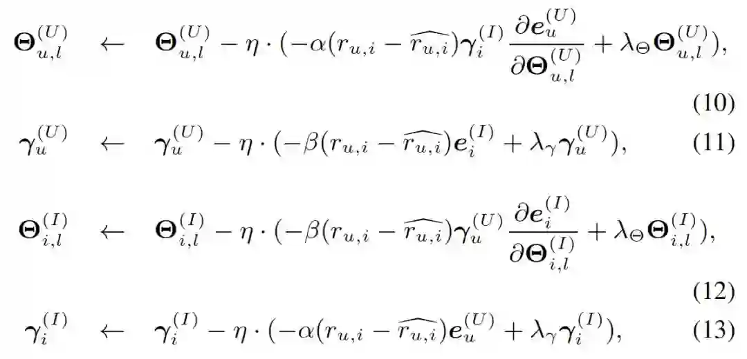 利用预测的user-item rating和真实的user-item rating之间的误差和矩阵分解技术(下图),就可以学习到那些参数了。