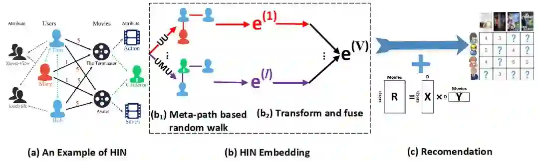 【导读】异构网络可以很好地建模推荐系统中的用户、物品和属性,如何利用异构网络来提取用户、物品的特征,并预测user-iterm rating是一个比较有挑战性的问题。网络节点表示学习(NRL)是一个不错的方案,但大多数NRL算法都基于同构网络设计,因此在将其应用在异构网络时,需要做许多改进。本文中的算法使用基于Meta-Path的随机游走、节点过滤、特征融合、矩阵分解等技术,设计了基于异构网络的推荐算法,取得了很好的效果。