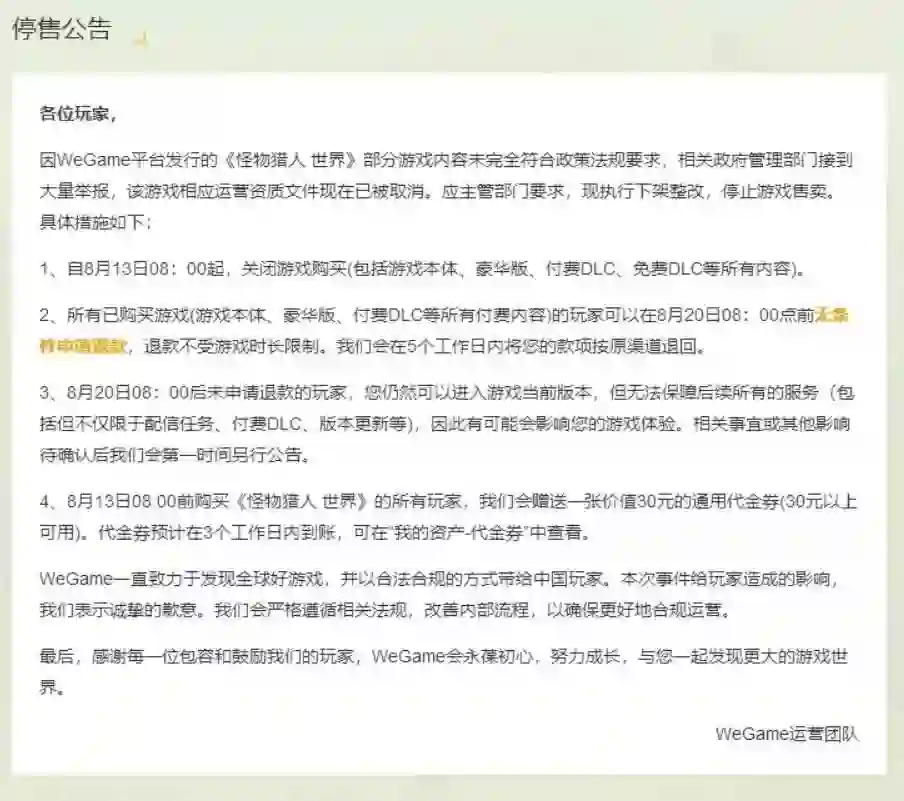 今天上午,腾讯游戏平台(WeGame,即原TGP),在《怪物猎人世界》的游戏页面,发布停售公告称,“因 WeGame 平台发行的《怪物猎人世界》部分游戏内容未完全符合政策法规要求,相关政府管理部门接到大量举报,该游戏相应运营资质文件现在已被取消。应主管部门要求,现执行下架整改,停止游戏售卖。”