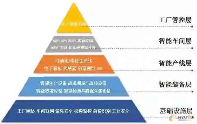 智能工厂可以分为基础设施层、智能装备层、智能产线层、智能车间层和工厂管控层五个层级: