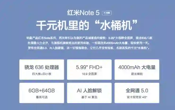 2018 年 3 月 16 日,红米 Note 5 发布,该机采用 18:9 全面屏,全球首发骁龙 636 处理器,搭载 AI 双摄像头,售价 1099 元起。