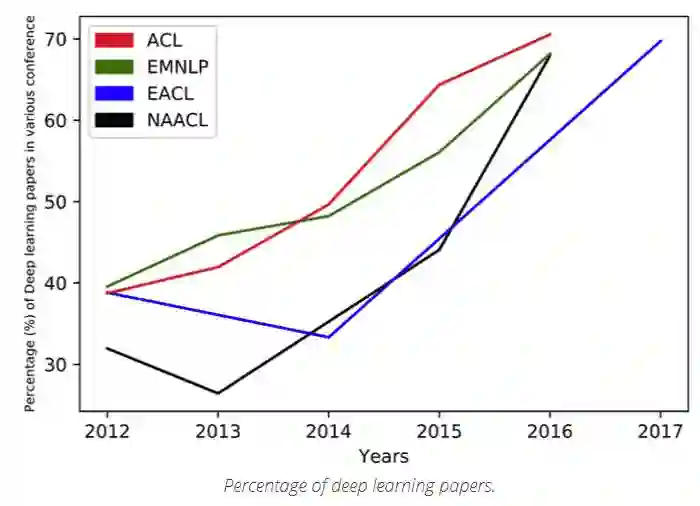 DL技术的使用在解决NLP问题中的稳步增长是不容置疑的。最能说明的一个指标就是过去几年中,深度学习论文中使用关键NLP会议中的占比的变化,例如ACL、EMNLP、EACL和NAACL。