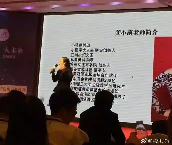 近日,一张某线下的照片在网上流传,图上一个女子在台上演讲,背后PPT上个人简介第一行赫然写着“小程序教母”几个字。腾讯公关总监@腾讯张军 也发微博吐槽:“我是不是应该去跪拜一下?”。