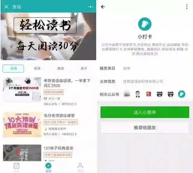 “小打卡”是一个习惯养成类小程序。用户可以加入阅读、培训、作业、早起、健身等多个兴趣社群,签到打卡。