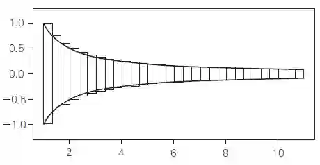 首先,给出一个无线延伸的反比例函数曲线 y = 1/x (图 102)。可以观察到当 x = 0 时,y 的值是趋近于无限大的,因此为便于论证,我们以 x = 1 为节点,对这条无线延伸的曲线进行截取。这样就可以得到一条极度细长的曲线,这条曲线是向坐标轴右侧无限延伸的。当然,图 102 中只给出了这条曲线有限的一段,理论上,完整地呈现出来的话应该是像一条无限延伸的细长尾巴。