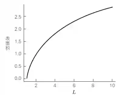 可以看到,与图 106 的曲线,也就是小号体积随长度变化的曲线相比,随着长度的增加,表面积增长的幅度更为剧烈。不过,从这个结果也还是无法明确得出小号的表面积是否真的是无限大。