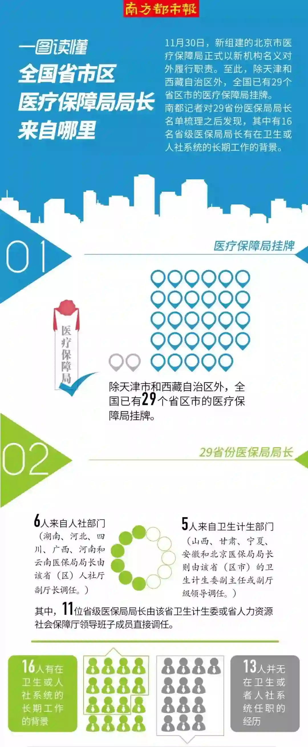 南都记者梳理发现,在29省份当中,13个省份的医保局局长并无在卫生或者人社系统任职的经历。从全国来看,医保局局长的构成背景多元。