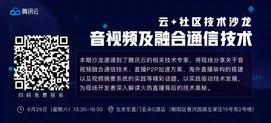 6月29日,腾讯云【音视频及融合通信】技术沙龙,将围绕AI技术在视频智能识别场景下的落地实践,为现场开发者阐述如何更加紧密将视频直播与AI技术相结合。限时免费报名通道开启中,扫描【下图二维码】或点击【阅读原文】即可免费报名。