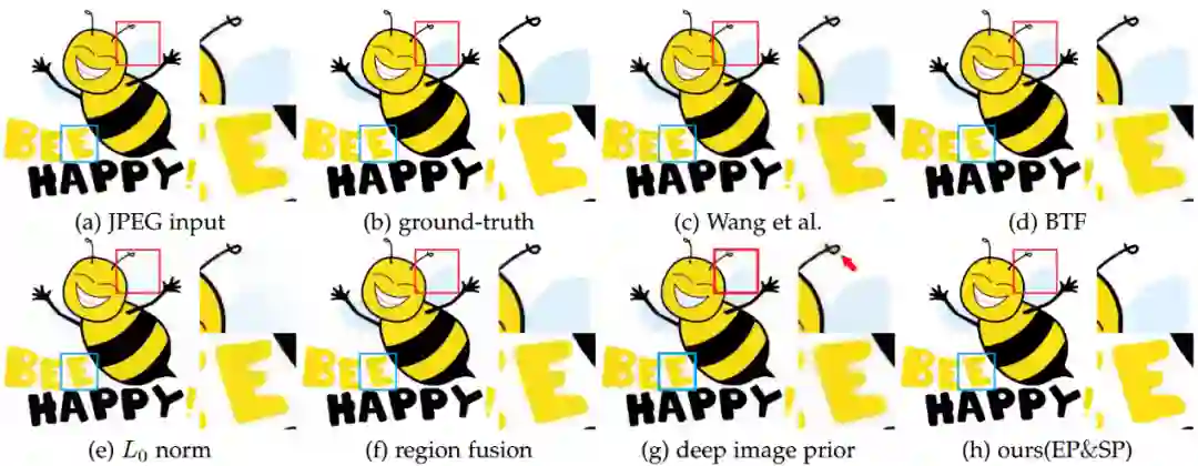 对于第二类任务,我们将算法应用于卡通图去压缩伪影,实验结果如图6所示。从结果中可以看出我们的算法对于锐化强边界和保持弱边界方面都有着很好的表现。