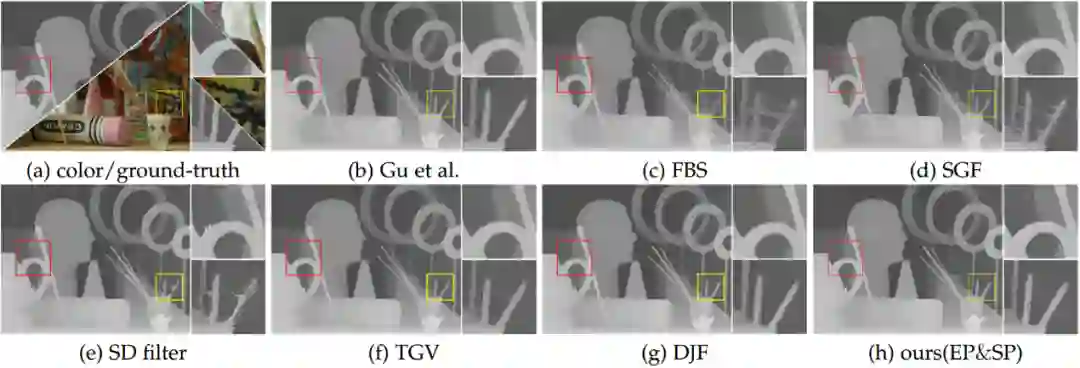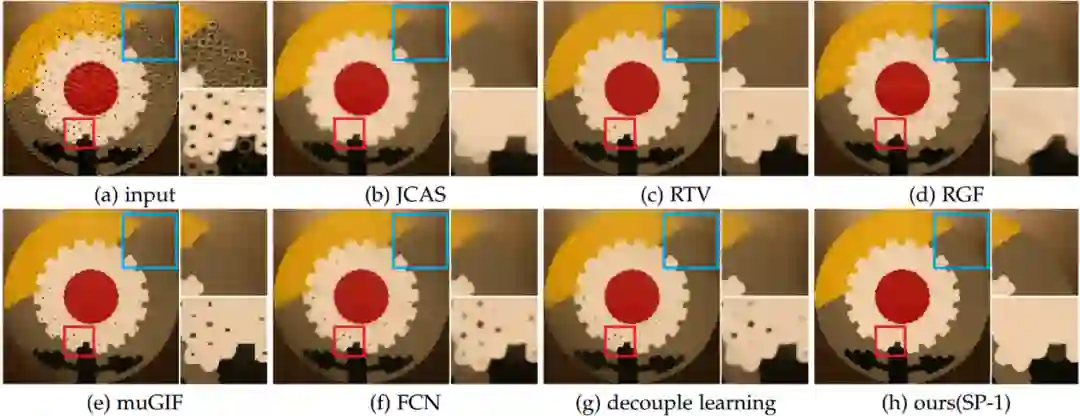 第三类为引导图像滤波,包括引导深度图超分辨和闪光/非闪光图像滤波等。这类任务的主要难点问题是对目标图和引导图结构不一致问题的鲁棒性,因为结构不一致会导致平滑后的图像存在纹理拷贝或者模糊边界的问题。同时由于目标图中往往含有噪音,因此这类任务还需要平滑后的图像边界能够被锐化,如图1(c)所示。