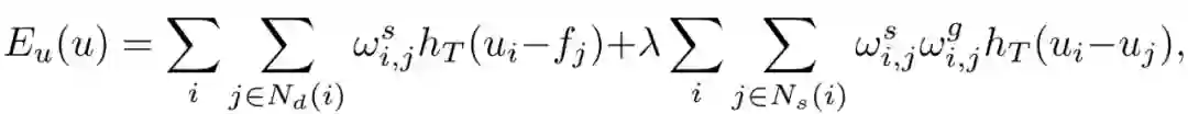 通过使用截断Huber惩罚函数的高度灵活性,我们可以有效构建一个高效的目标函数来实现多功能的平滑处理。在给定输入图像f和引导图像 g 的前提下,输出图像 u 是下列目标函数的解:
