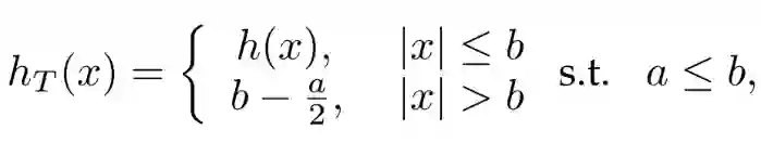 而截断Huber则引入了一个新的参数 b 来对 x>b 的区域进行饱和处理,所有超过的值都将被限制在 b-a/2 的数值上: