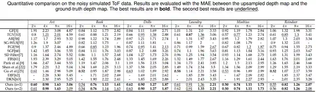 对于第三类任务,我们将算法应用于引导深度图超分辨,实验结果及对比如图7所示,同时下列表格中展示了量化对比。可以看出我们的算法取得了当前最好的实验结果。