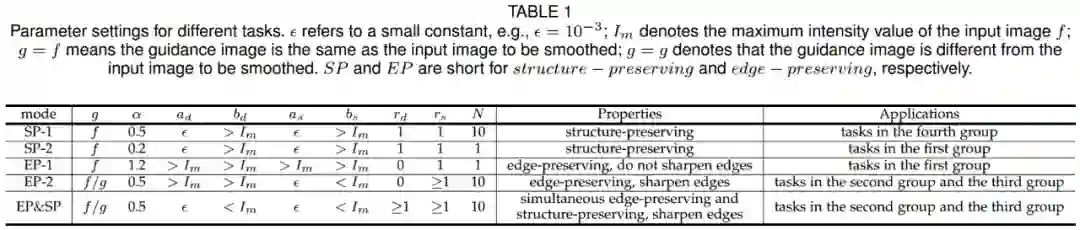 图像平滑滤波在计算机视觉以及图形图像学领域有着广泛的应用,同时不同的应用任务往往对平滑滤波特性有着不同的需求。然而当前大部分滤波器其内在平滑特性往往是固定的,因此只能适用于部分任务,同时当前大部分算法并没有对应用任务作出明确分类,因此其应用场景并不是很明确。为此,我们首先将大部分应用任务分为以下四类。