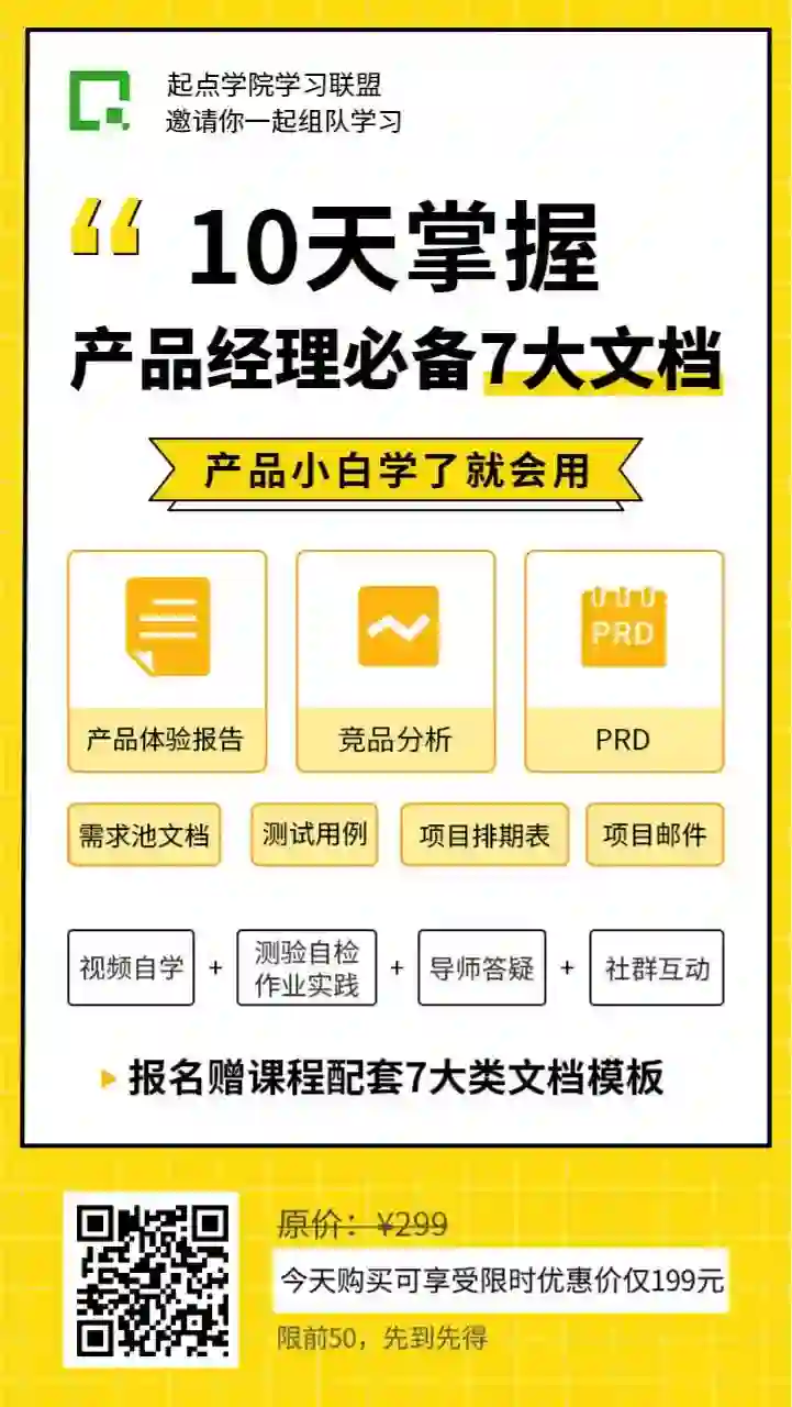 为了帮助这些产品新人快速掌握文档撰写基本功,这里推荐由起点学院联合惠买集团产品总监@陈滨淋 老师打造的【10天掌握产品经理必备7大文档】学习计划。从实例出发,带你高强度系统性学习7大类常用的产品工作文档,快速帮你规范化日常文档,提升工作效率。