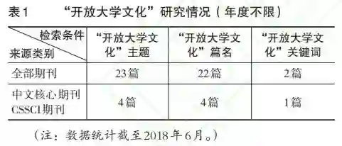 截至2018 年6 月,笔者在中国知网上以“开放大学文化”为“主题”“篇名”和“关键词”进行检索,可得到如表1 所示的检索结果。