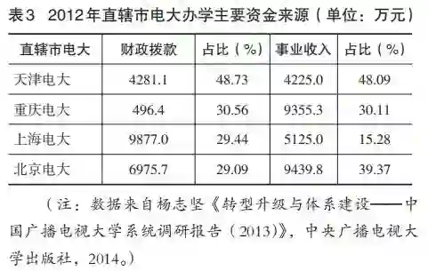 无论电大还是开放大学,所面临的最大挑战是人才培养质量问题。电大要切实解决学生“低进低出” 的现象,就必须从根本上解决以“学生数量维系生 存”的问题。如果把电大系统看作一座大厦,那么它 的地基究竟是什么,值得深思。20世纪70-80年代电大建校的地基首先是政府的财政投入(历史上各地电大与教委有着多种“藕断丝连”的关系,教育主管部门是政府扶持电大建校的初始支柱),其次是无数莘莘学子的求学梦和华罗庚教授精彩的第一课。然而, 随着市场经济的发展和各类高校招生规模的扩大,电大的地基在“隐性”地被“缩水”,生源减少了,生均拨款减少了,华罗庚式的授课渐行渐远了,而远程教育的硬件投入却增加了,只顾文凭的学生增加了。2012年全国省级电大财政拨款平均所占比例为40.6%(杨志坚,2014),以4 所直辖市电大为例,只有天津电大的财政拨款略超过了平均数(见表3),这就表明全国电大有一半以上的经费来源要靠自己“创收”,如 果学生“低进高出”,就等于生源走向断流,学校 “入不敷出”。除了教学经费不足外,还存在有些地方政府对电大的定位和作用不重视的现象,例如,54%的地市级电大和78%的县级电大均被整合到其他 教育机构(杨志坚,2014),这表明随着政府投入的减 少,电大原有的地基发生了动摇。以保证生源保持电大发展的“求生”之路,似乎理所当然。但当社会对电大的“含金量”提出质疑时,我们才意识到电大真正的地基是教育质量。所以,这些年开放大学 狠抓教学质量、考试质量,不断提高办学“含金量”,开放大学的质量文化建设正在走向成熟。