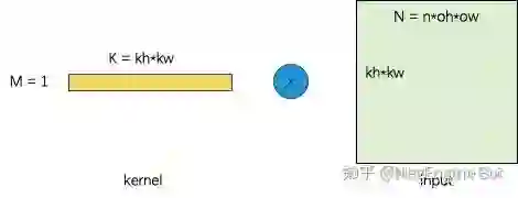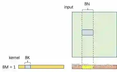 如果我们保持和 Dense 卷积一样的分块策略的话,每个 batch 的 GEMV 如下图所示。相应的此时的计算密度为 。先不说这是一个 Batched GEMV,单独看一个 GEMV 也不难发现此时的计算密度是很差的,BN = 1 时最高大概能达到 0.25 FLOPs/Byte,相应的最大达到的性能 P = 0.25*2.16 = 0.54 TFLOPS。当然了实际应用中 GEMV 还有其他计算方式,我们的分析方法就不一定准确了。但此处想表达的意思是 Batched GEMV 和 GEMM 的优化难度相去甚远。假如 kernel 为 3x3,此时 M=1, K=9, N 受限于 oh 和 ow 也不会很大,此时的 GEMV 性能肯定远达不到峰值,并且 GEMV 也不能利用 TensorCore 加速。