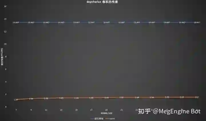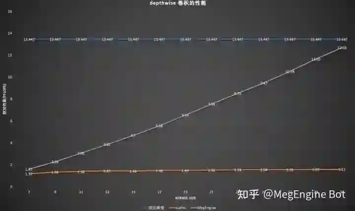 鉴于以上分析,大 kernel depthwise 卷积有很大的优化潜力,所以 MegEngine 紧跟学界动态对大 kernel depthwise 卷积进行了深度优化。如上图所示,经过我们的优化后,随着 kernel size 的增加,算子性能基本呈现线性增长的趋势,部分情况下算子可以逼近硬件的单精度浮点理论峰值。