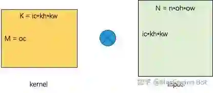 对 Dense 卷积而言,一种通用优化计算手段就是 im2col/implicit GEMM。由于其太经典了我们在这里不再赘述 im2col 的过程,感兴趣的可以翻阅我们之前写的文章《MegEngine TensorCore 卷积算子实现原理》。在经过了 im2col 变换之后,我们就成功的将卷积转换成了矩阵乘的形式。其中矩阵乘的 M = oc, N = n*oh*ow, K = ic*kh*kw,具体如下图所示。