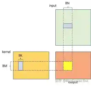 对于矩阵乘特别是大规模矩阵乘,cuBlas 等计算库已经优化的足够好了,基本上可以接近设备理论峰值,这里我们结合 Roofline 简单分析一下性能。为了充分适应硬件体系结构特征,充分利用多级存储增大访存带宽,我们需要对矩阵乘进行分块计算。如下图所示,假如 cuda 中每个 Thread Block 处理 BMxBN 的 output,此时 kernel 分块大小为 BMxBK,input 分块大小为 BKxBN。则计算量为 BM*BN*BK*2,访存量为 (BM*BK + BN*BK)*4。计算密度为 。按照 Roofline 模型的描述,计算设备的 FLOPs/Byte,若要达到设备理论峰值我们只要保证计算密度大于 IM 即可。如果我们按照 BM=32, BN=32 来算的话,则此时的计算密度将达到 8 FLOPs/Byte,显然是大于 IM 的。此时如果忽略 TP 的限制假如打满设备最大带宽,最大可能达到的性能 P = 8*2.16 = 17.28 TFLOPS。结合 Roofline 模型不难看出此时处于 Compute Bound 区域。由于 Compute Bound 区域的计算速度已经接近理论峰值,已经不能增加了。如果我们采用大 kernel 的话,随着 kernel size 的增加计算量会呈平方增长,所以相应的运行时间也会随之增长,这显然是不可接受的。