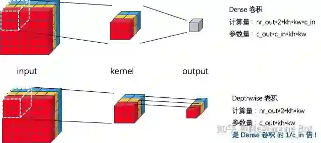 CNN 中最常见的卷积 kernel 大小有 2x2, 3x3, 5x5, 7x7 等,在本文中我们将卷积 kernel 大小超过 9x9 的视作大 kernel。我们不难看出随着卷积 kernel 大小的增加,卷积的参数量和计算量都呈平方增长,这往往也是大家不喜欢用大 kernel 卷积的其中一个原因。为了获得大 kernel 卷积带来的收益的同时降低其计算量和参数量,我们一般将大 kernel 卷积设计成 depthwise 卷积。如下图所示,depthwise 卷积通过逐通道(channel) 做卷积,可以将计算量和参数量降低到 Dense 卷积的 input channel 分之一。