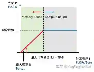 "Roofline" 指的是由计算设备理论算力峰值和最大访存带宽这两个参数所决定的“屋顶”形态。其中设备理论峰值决定“屋顶”的高度(蓝色线段),设备最大访存带宽决定了“屋檐”的斜率(红色线段)。Roofline 模型划分出来两个瓶颈区域,分别为 Compute Bound 和 Memory Bound。