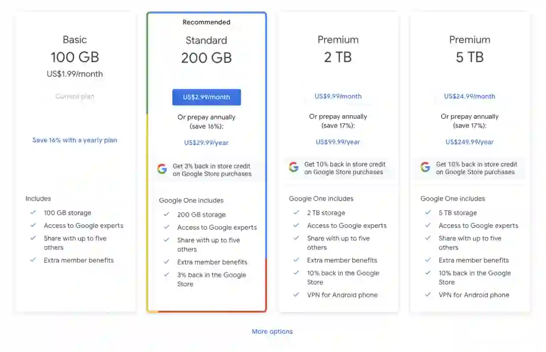 尽管我的设备间云服务的需求大多集中在照片和文档这很基础的两方面,在体验了数种跨 Android 、 iOS 和 macOS 的云服务平台后,还是谷歌提供的服务最接近我心目中的理想方案。去年 5 月入手了 Pixel 3 之后,我的主力拍照设备就从 iPhone 变成了 Pixel ,而亲儿子自带谷歌相册无限容量备份即将在今年 1 月 31 日迎来终结,在对比了 iCloud 网页版的糟糕体验之后,本着未雨绸缪的心态订阅了谷歌对数项业务进行整合之后的 Google One ——一项对云端硬盘、谷歌相册和 Gmail 等提供容量扩展和手机备份的服务,其中 100GB 的套餐当前价格为每月 1.99 美元。