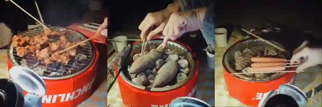 使用的方法很简单,打开包装,将果木炭倒入炉体中,然后点燃其中一片放入即可。如果是烤肉,可以将金属烤网放在上面用长尾夹固定住,将肉放在烤网上面烤;如果是烤番薯,就直接将番薯埋入炭里即可。我们烤了一袋羊肉串、奥尔良鸡翅、香肠和番薯,因为在学校不好腌制食材,我是直接去山姆买的腌制好的食材。但由于炉子的尺寸以及等待烤熟的时间限制,烧烤效率着实有限,带去的玉米、香蕉等并没有上炉,鸡翅和香肠也没有全部烤完。