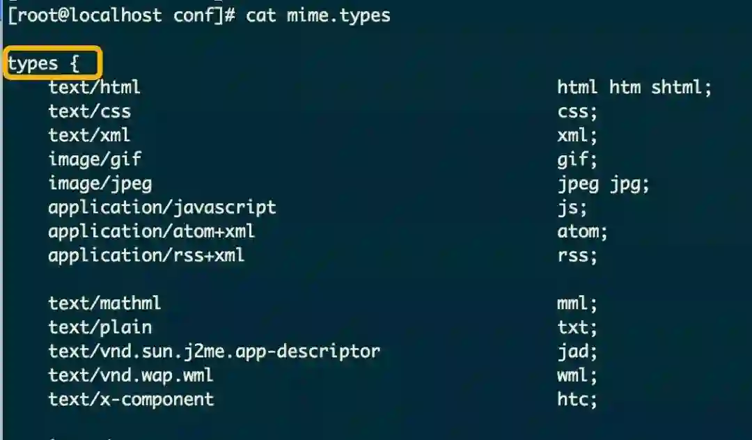 cat mime.types 来查看mime.types文件内容,我们发现其就是一个types结构,里面包含了各种浏览器能够识别的MIME类型以及对应类型的文件后缀名字,如下所示: