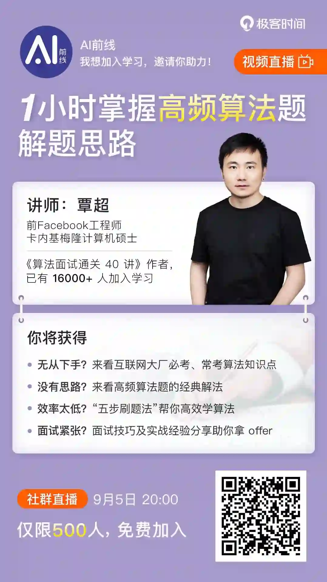 老师会在直播中现场解题,向你展示高频算法题的经典思路,举一反三,相信这些思路能够帮你带来更多思考。