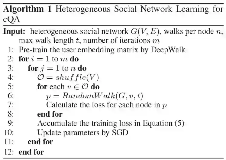 在本文中,作者提出一种新奇的框架,它不仅对问题和答案的内容进行编码,并且对社区中用户的交互信息进行编码,来辅助解决CQA任务。框架协同地利用问题、回答和回答者之间的交互关系来学习回答的相对质量。另外,作者使用深度随机游走框架来充分利用异构社交网络中的信息,来提升问答匹配的效果。在大规模真实CQA数据上的实验表明,借助异构社交信息,提出的算法超过了当前最好的CQA算法。