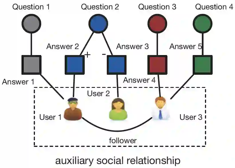 下图展示了CQA中的社交异构网络。网络中有三种节点(问题、回答和回答者),网络包含了它们之间的关系信息。可以看出,问题和回答之间的连接比较稀疏(4个问题互相之间没有连接,且只有回答2和回答3 )。HSNL有效地利用了网络中蕴含的丰富的交互信息,例如,对于同一个问题,不同用户给出的高质量回答和低质量回答之间的差异,以及用户之间的关注信息。这些丰富的交互信息对CQA任务很有用。