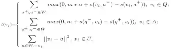 前两个式子是标准的triplet loss,例如第2个式子的意思是“问题vi与回答q+的相似性要大于问题vi与回答q-的相似性”。这里使用的是类似SVM的Max-Margin Loss,在第二个公式中,用一个固定值m作为margin的大小,而在第一个公式中,margin的大小被表示为m*α,margin的大小会根据不同的情况改变,当a-是一个无关的回答时,α被设置为1,当a-是一个低质量的回答时,α被设置为: