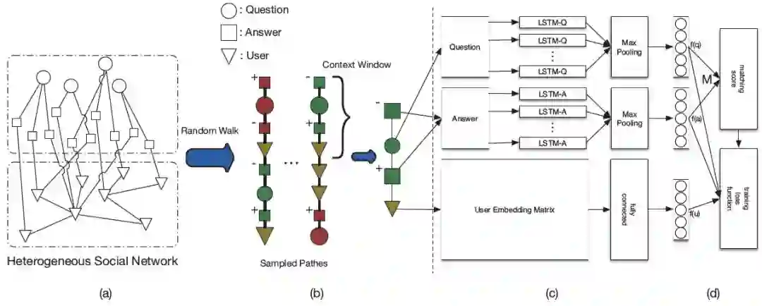 首先,HSNL利用Random Walk采样大量的节点序列,如上图(b)所示。首先,HSNL利用Deep Walk为每个回答者预训练了一个低维表示。然后,HSNL在序列上使用滑动窗口进行扫描,对每个窗口内的问题、答案和回答者节点做了如下约束: