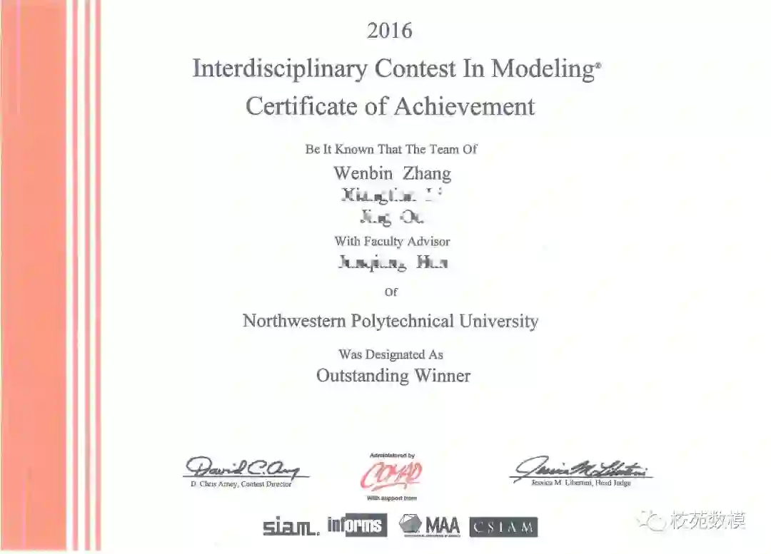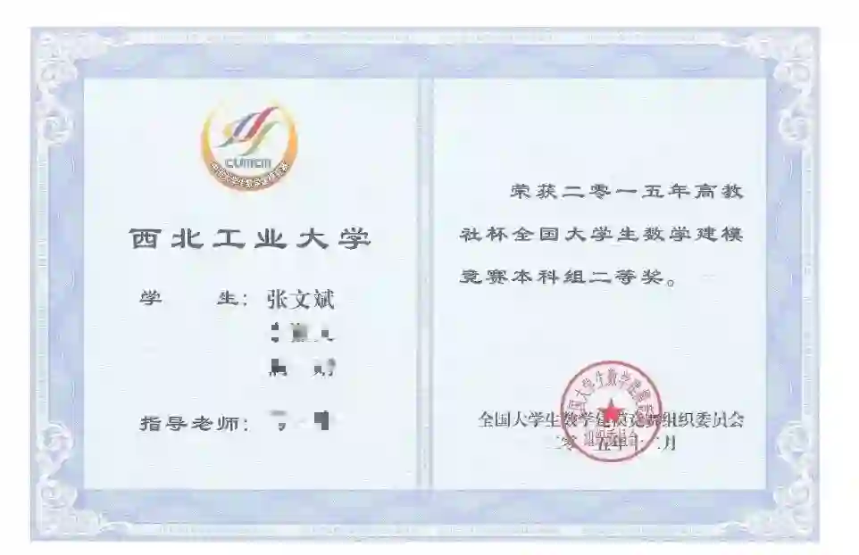 张文斌 上海交通大学博士生,2016年美国大学生数学建模竞赛特等奖,2015年高教社杯全国大学生数学建模竞赛二等奖;高中期间获全国高中数学联赛浙江省一等奖,全国高中物理竞赛浙江省二等奖;大学期间负责学校数学建模竞赛的指导和赛前培训,开展多次数学建模竞赛辅导课程和讲座。