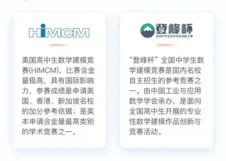 中学生数学建模竞赛在国内起步较晚,参赛人数竞争较小,相对其他奥赛是一个投入时间短、容易获得高奖的竞赛。参赛成绩是申请美国、香港、新加坡名校的加分参考依据;是美本申请含金量最高类别的学术竞赛之一。