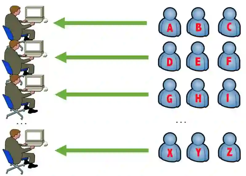 下图是上一个的进化版,如果一个柜员不够,那么就 并发处理,对应采用线程池或者多进程方案,一个客户对应一个柜员,这明显加大了并发度,在并发不高的情况下性能够用,但是仍然存在柜员被 I/O 阻塞的可能。