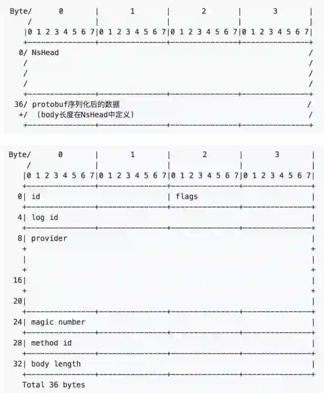 可以看出它的协议栈 header+payload 方式的,header 固定 36 个字节长度,最后 4 个字节是 body length,也就是 payload length,可以使用大尾端或者小尾端编码。
