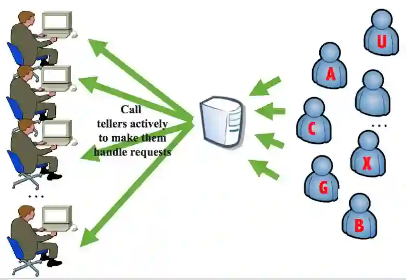 下图是使用 传统的阻塞 I/O 模型。一个柜员服务所有客户,可见当客户填写单据的时候也就是发生网络 I/O 的时候,柜员,也就是宝贵的线程或者进程就会被阻塞,白白浪费了 CPU 资源,无法服务后面的请求。